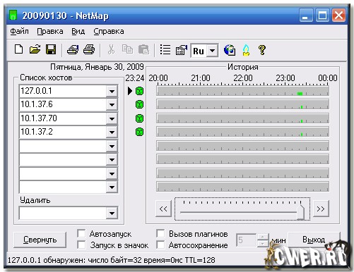 Выпущена новая версия NetMap. Это небольшая программа, предназначенная для отслеживания доступности узлов в сети по протоколу ICMP. Для этого периодически направляются запросы, в точности аналогичные запросам программы ping, и проверяется наличие откликов, свидетельствующих об активности соответствующих узлов и штатной работе каналов связи. Программа настроена на отправку запросов с интервалом в 6 секунд и ожидание отклика в течение 4 секунд. При необходимости можно задать любое время в пределах от 100 миллисекунд до 10 минут. Узлы, которым направляются запросы, выбираются из заданного списка в циклической последовательности. Список может содержать большое количество узлов (более ста), при этом в главном окне программы можно наблюдать по выбору реакцию до тридцати узлов, в зависимости от размеров окна программы. Полученные отклики добавляются к ежедневному протоколу, который можно просматривать, выводить на печать и сохранять в файл на диске. Разрешение протокола - одна минута. Если какой-либо узел не отвечает на запросы в течение заданного времени, то предусмотрена возможность запуска внешнего командного файла.