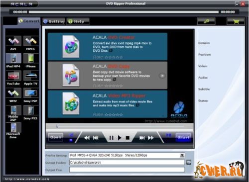 Программа конвертирует (рипает) DVD фильмы в AVI, DivX, XviD, VCD, SVCD, MPEG1, MPEG2, MPEG4 видео-форматы одним щелчком мыши.