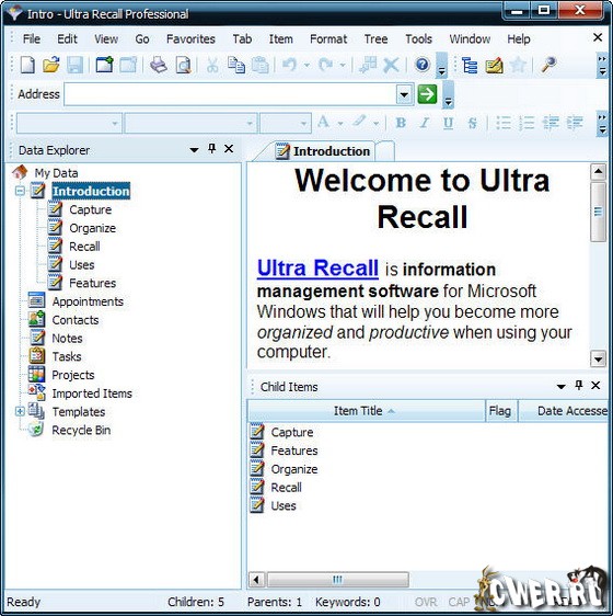 Ultra Recall Professional - это современный трансфертный информационный менеджер для решения широкого спектра задач по захвату поступающих информационных данных и документов, их сохранению, классификации и упорядочению на основе "дерева элементов". Всего того, с чем вы сталкиваетесь в своей работе, всего, что прошло через ваши руки, и что вас заинтересовало! Это могут быть контакты, документы, веб-страницы, PDF, интересная информация, справочники, менеджер софта с описанием и т д. и т п., - все, что можно себе только представить. В продукте очень много, как привычных, так и непривычных возможностей. Например, полнотекстовый поиск не ограничивается страницами HTML, а включает также файлы PDF и офисных приложений и многое другое.