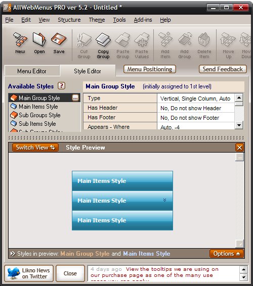- быстрое создание меню, используя встроенные стили из Галереи AllWebMenus Pro;