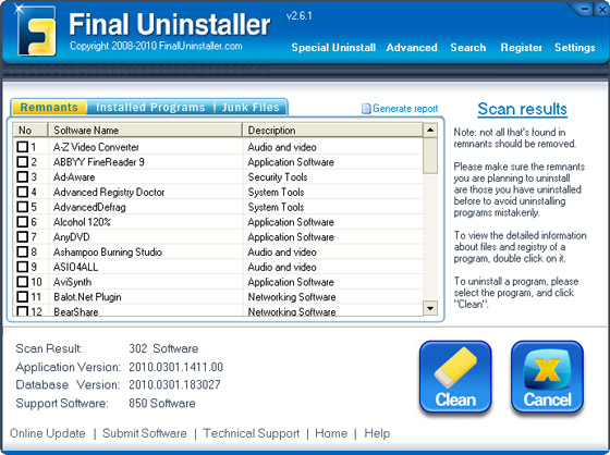 Final Uninstaller - программа позволяет очищать жесткий диск и системный реестр от мусора, оставшегося после удаления каких-либо программ. Программа использует высокоэффективный алгоритм обнаружения, который позволяет быстро просканировать систему и найти ненужные файлы и записи в системном реестре для каждой установленной программы на вашем компьютере. За несколько щелчков мыши программа просканирует ваш жесткий диск и реестр Windows, после чего предоставит вам список приложений, которые были неправильно деинсталлированы. После чего вы сможете выбрать приложения для последующего их полного удаления с компьютера. Программа имеет понятный пользовательский интерфейс и проста в использовании, поэтому подходит для любого пользователя.