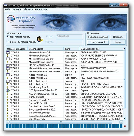 Product Key Explorer позволяет расшифровать и увидеть, а также сохранить серийные номера (Product ID, Product Key, License Info, User Name, Company) продуктов Microsoft, CD-key установленных на компьютере программ, и не только их. Неполный список ПО, регистрационные данные которых можно увидеть и сохранить: Micrsoft Windows (2000, XP, 2003, Vista), Microsoft Office 2003, Microsoft Office 2007, Microsoft Office XP, Micrsoft Visual Studio 2005, Macromedia, Ahead Nero, Adobe Photoshop, CyberLink PowerDVD, Borland Delphi и т.д.