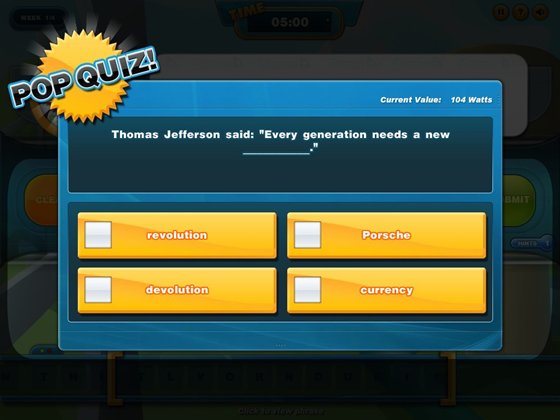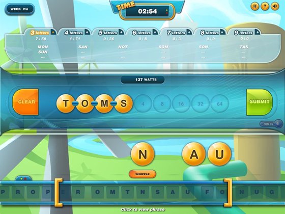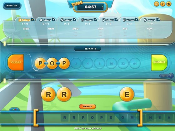 Организуйте ваш собственный "Зеленый бизнес" и создайте флот ультрасовременных генераторов, чтобы обеспечивать местные города "чистой энергией". Свергните жадных конкурентов начните Зеленую Революцию, используя Ваши словесные навыки в Word Power: The Green Revolution. Заработайте деньги и постройте различные генераторы энергии, чтобы стать успешным "Зеленым магнатом"!