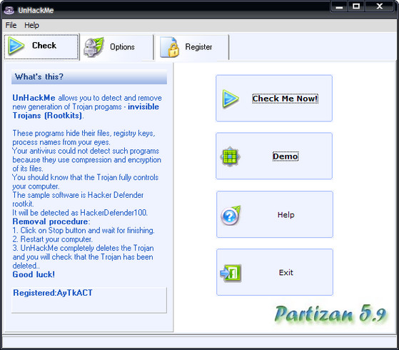 UnHackMe позволяет вам обнаруживать и удалять новое поколение троянских программ - скрытые Трояны. Их называют "rootkits". Rootkit - набор программ, которые хакер использует, чтобы замаскировать вторжение и получить доступ с привилегиями администратора к компьютеру или компьютерной сети.