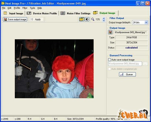 Известный своим качеством снижения шумов, Neat Image используется многими фотографами для очистки и обработки фотографий. Понимая важность снижения шумов при недостаточном освещении и скоростной фотографии (sport, action), Neat Image использует новый, значительно улучшенный алгоритм. Учитывая рост размеров матриц в цифровых фотоаппаратах, новый Neat Image более эффективно и более быстро осуществляет все процессинговые процедуры, чем предыдущие версии Neat Image.