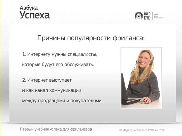 Ежели Вы желаете выяснить правду о заработках в Сети, ежели Вы желаете начать реально работать и зарабатывать в интернете, ежели Вы желаете стать фрилансером, и обязательно удачным, то бесплатный обучающий видеокурс для Вас. Это первый правдивый пошаговый видеокурс от двух удачных фрилансеров для всех, кто может и желает добиться фурора на рынке фриланса в Рунете.