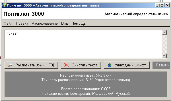 Полиглот 3000 (или сокращённо П3000) – это автоматический определитель языка, который предназначен для быстрого и корректного определения того на каком языке написан введённый Вами текст. Текущая версия Полиглота 3000 распознаёт 474 языков и диалектов. На сегодняшний день это самое большое число распознаваемых языков, которые поддерживают современные распознаватели языков.