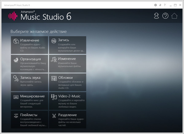 Ashampoo Music Studio – полнофункциональный программный пакет, предназначенный для работы с аудиофайлами, умеющий копировать аудиодорожки на жесткий диск в форматах WMA, MP3, OGG, FLAC и WAV. Также программа позволяет пользователю создавать плейлисты, записывать диски всевозможных форматов, редактировать аудиодорожки и т.д. Программа пригодится всем, кто имеет дело с цифровой музыкой. В последнюю версию включено все необходимое для создания, редактирования и управления вашей коллекцией цифровой музыки. Вы сможете резать и микшировать файлы, записывать созданные композиции. Также программу можно использовать в качестве обычного музыкального плеера. Обладает красивым и легким в использовании пользовательским интерфейсом с многоязычной поддержкой, включая поддержку русского языка.