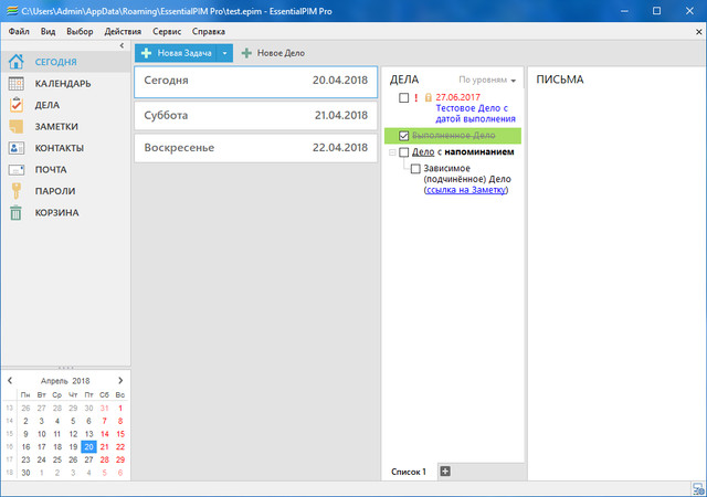 EssentialPIM - высокофункциональный менеджер персональной информации с продуманным интерфейсом и множеством возможностей. Содержит средства для работы с календарем, списком задач, заметками и контактами. Есть широкие возможности для печати, импорта и экспорта информации, возможность запуска с переносных USB накопителей (включая U3 SmartDrive - сертифицированную версию), синхронизация с карманными компьютерами и смартфонами работающими под управлением WindowsMobile, PalmOS. Поддерживается 128-битное шифрование, экспорт/импорт данных из MS Outlook, Windows Address Book, расширенный поиск, различные опции печати. Также включает в себя инструмент для хранения контактов с неограниченным количеством полей.