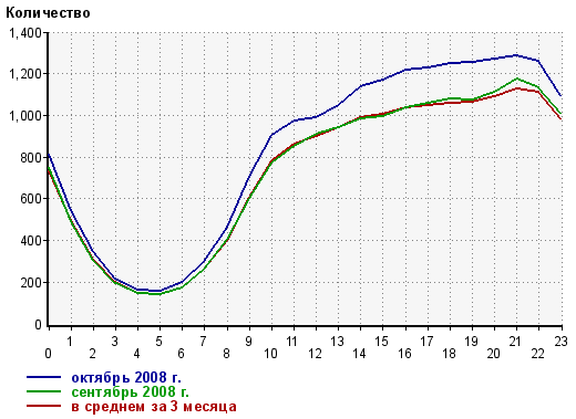 Дело в том, что вместе с приходом осени увеличивается и количество посетителей любого сайта, и это несомненно хорошо. Но обратной стороной медали является резкое увеличение нагрузки на сервер, на котором расположен наш сайт. Если кому интересно, то на данный момент мы арендуем выделенный сервер на базе процессора Intel Core 2 Duo 6600 с 2 ГБ оперативной памяти, не совсем серверная машина, но на лучшее нужны бо'льшие деньги. Так вот с приходом осени база данных стала испытывать большие нагрузки, но справлялась. Начиная с октября, как вы сами наверняка заметили, зайти на сайт днем практически невозможно - отклика ждать нужно около минуты и т.д. Одним словом, перегрузка. На рисунке ниже показана диаграмма количества online-посетителей по часам на последние два месяца:
