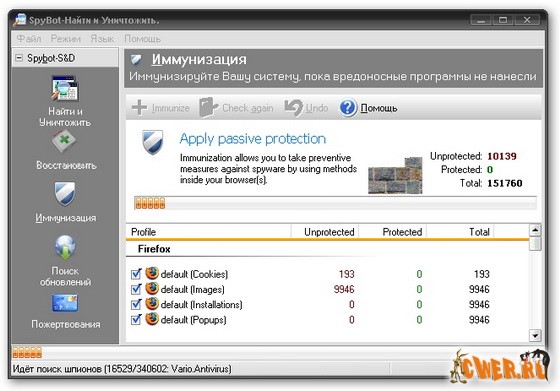 Spybot - Search & Destroy может обнаруживать и удалять с Вашего компьютера различного рода шпионское программное обеспечение. Шпионское ПО (Spyware) - относительно новый вид угрозы, который еще недостаточно широко обрабатывается стандартными антивирусами. Шпионское ПО молча отслеживает ваше поведение за компьютером, чтобы создать ваш "маркетинговый профиль", который так же молча передается сборщикам информации, продающим ваши данные рекламным организациям. Если Вы видите в Вашем браузере новые панели инструментов, которые Вы явно не устанавливали, если браузер постоянно "падает" или стартовая страница неожиданно изменилась, то вполне вероятно, что в Вашем компьютере завелся "шпион".