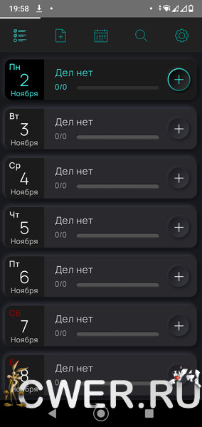 Ежедневник "Мои Дела" обладает удобным интерфейсом, с которым легко контролировать как текущий день, так и рабочую неделю одновременно. Для этого главный экран приложения специально разработан в виде рабочей недели (пн.-вс.), где легко планировать список задач и переносить запланированные дела на более удобное время.
