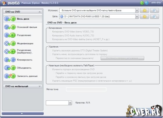 DVDFab Platinum – мощный, многофункциональный программный продукт для копирования DVD дисков с возможностями гибкой обработки видеопотока. Программа является одной из лучших на сегодняшний день, из инструментов для копирования, разбиения, пережатия и конвертирования DVD дисков с фильмами. Снимает все защиты и ограничения с диска и при желании пережмет диск большой емкости и вместит его в обыкновенную пустую DVD болванку с минимальными потерями качества (DVD9->DVD5) или разобъет фильм на два диска с полным переносом его меню, удалит всю рекламу, запишет только фильм и многое другое. Программа имеет интуитивно понятный, мультиязычный интерфейс включая русский.