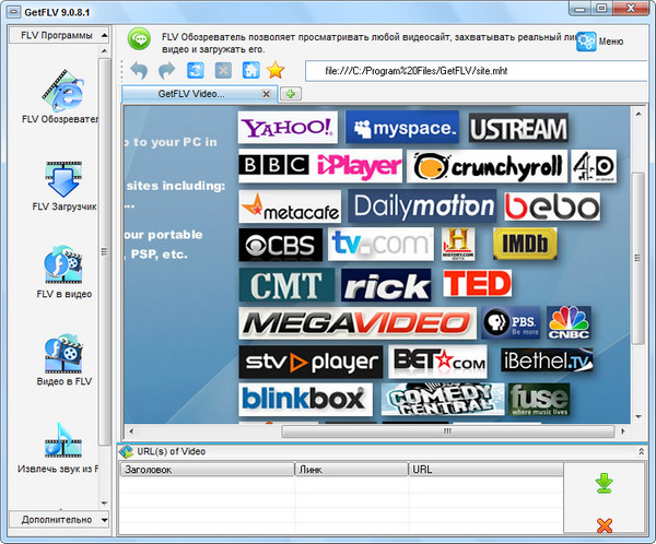 GetFLV Pro - это сборник из 7 модулей, который позволяет производить весь спектр операций с .flv файлами. GetFLV Pro позволяет скачивать, управлять, конвертировать в различные форматы и из различных форматов, извлекать звук, восстанавливать и воспроизводить FLV видео.