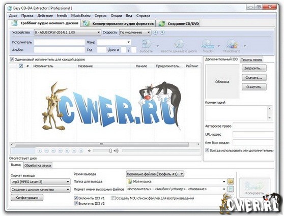 Easy CD-DA Extractor - программа для преобразования аудио-CD в качественные цифровые аудиофайлы, а также для записи MP3, WAV MP4, Windows Media Audio, FLAC, Ogg Vorbis, AAC и Monkey-s файлов на аудио-CD. Допускается преобразование аудиотреков непосредственно в MP3, WMA, VQF, OGG или WAV и конвертирование из одного аудиоформата в другой.