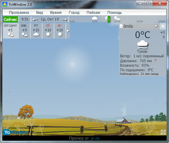 YoWindow - современная утилита для отображения прогноза погоды, это необычная и уникальная программа, при помощи неё вы можете, не смотря на цифры, определить погоду, потому что все погодные условия отображаются на красивом изображении в точности до расположения солнца. Вся погода на картинке реальна будь то облачность, дождь, снег, туман, трава движется вместе с ветром. Картинка проживает свою виртуальную жизнь и отображает реальные данные с природными явлениями и сменой дня на ночь.