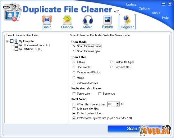 Duplicate Files Cleaner - мощная и профессиональный инструмент для 100% -го, "Бит-В-Бит" поиска и удаления одинаковых файлов с компьютера которые напрасно занимают место, тормозят работу жесткого диска и как следствие, снижают скорость работы самого компьютера. Duplicate File Cleaner - быстро находит и удаляет одинаковые файлы (дубликаты) независимо от их типа, - фотографии, музыку, видео или письма Outlook.