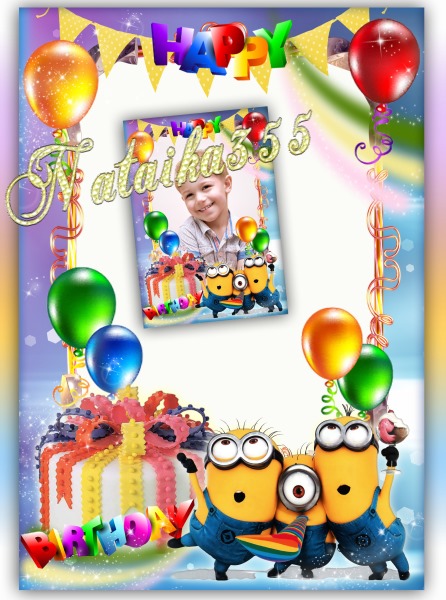 Яркая многослойная фоторамка с Миньонами и поздравлением с днем рождения.