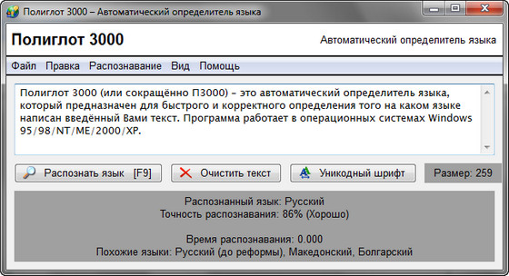 Полиглот 3000 (или сокращённо П3000) – это автоматический определитель языка, который предназначен для быстрого и корректного определения того на каком языке написан введённый Вами текст. Программа работает в операционных системах Windows 95/98/NT/ME/2000/XP/Vista/7.