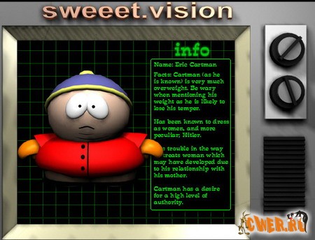 Интересный скринсейвер для всех любителей South Park. На экране телевизора периодически меняются 3D-фотографии главных героев мультфильма - Эрика Картмана, Кайла, Стена, Кенни и Шефа.
