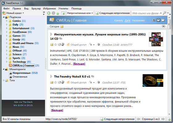 FeedDemon - одна из самых популярных программ для получения новостей с сайтов по технологии RSS и XML. По сравнению с обычным просмотром сайтов с помощью браузера, технология RSS имеет два существенных плюса - возможность практически полной автоматизации и значительное уменьшение объема скачиваемых данных за счет отсутствия в получаемых новостях рекламы.