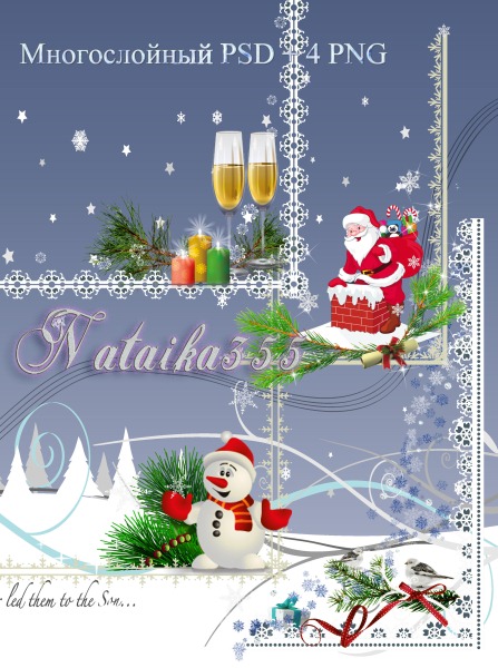 Весёлые снеговики, Дед Мороз, фигурки оленей, хлопья снега, запорошенные деревья, белая сова, кресло с игрушками, карусель, синие ленты и фоны с зимними узорами в скрап-наборе Noel.