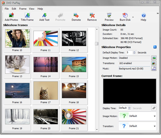 DVD PixPlay - программа для создания из картинок, видео и музыки, дисков формата DVD, VCD или SVCD. Поддерживает все популярные форматы графики (JPEG, JPEG2000, GIF, BMP, PNG и т.д.), форматы фотокамер (CRW, CR2, NEF и т.д.), звуковые (MP3 и WAV) и видео форматы (AVI, MPEG). Есть возможность добавления фоновой музыки и разных эффектов для последующего просмотра на DVD проигрывателе. Содержит более 160 графических эффектов.