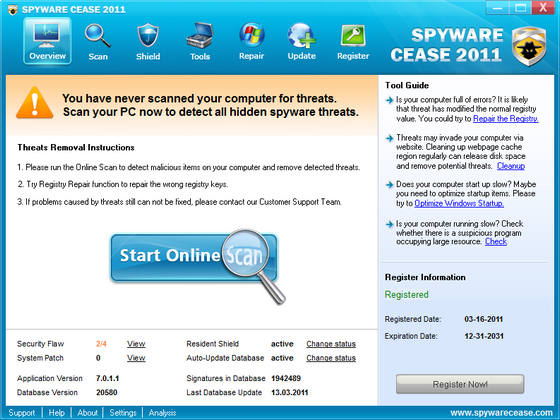Spyware Cease - программа для защиты вашего компьютера от шпионских атак, вредоносных троянских программ, которые могут вызвать нежелательные всплывающие окна, замедлить производительность вашего ПК или "снять" с системы какую-либо секретную информацию, без вашего ведома, в виде паролей доступа, номеров кредитных карт и т.п. С помощью данной программы вы сможете защитить ваш ПК от различных шпионских модулей.