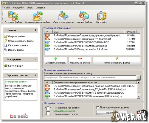 FILEminimizer Office - программа для сжатия презентаций PowerPoint, документов Word и таблиц Excel без изменения формата файла. Программа сможет уменьшить размер PowerPoint, Word и Excel файлов вплоть до 98% благодаря уникальной технологии сжатия, которая сжимает изображения и встроенные объекты, сохраняя исходный формат и качество файла. Оптмизированные файлы получаются значительно меньше в размерах и идеально подходят для совместного использования и обмена, а также для отправки этих документов по электронной почте.