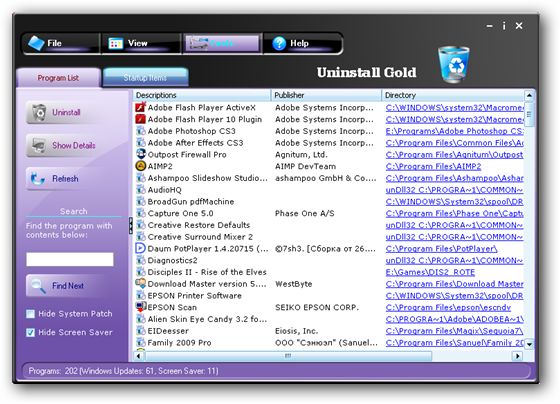 Uninstall Gold - программа для деинсталляции приложений. Обладает большим количеством функций: показывает скрытые установленные программы, сортирует список программного обеспечения по заданному фильтру, удаляет некорректно инсталлированные и деинсталлированные программы.