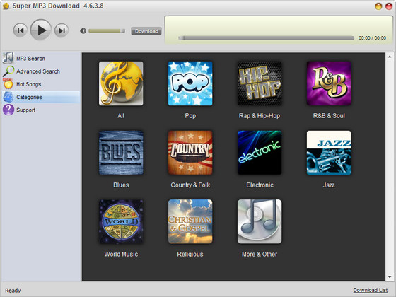 Super MP3 Download - прямой доступ к бесплатной музыке. Этот mp3 загрузчик надолго обеспечит Вас музыкальными композициями. В мире существуют тысячи групп и исполнителей, предлагающих свое творчество бесплатно. Шанс найти среди них что-нибудь по душе очень велик. Чтобы облегчить Ваш поиск, программа предложит топ сто недели и лучшее в четырнадцати жанрах. Вы сможете сначала прослушать мелодию и лишь потом сохранить её на жесткий диск.