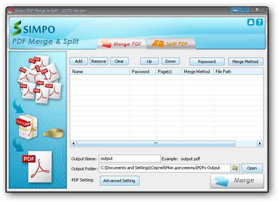 Simpo PDF Merge & Split - служит для соединения и разделения любых pdf файлов. Ипользуя функцию соединения, вы сможете соединять несколько документов или несколько страниц документа в один pdf файл. Функция разделения поможет вам извлечь страницы из документа или удалить отдельные страницы документа.
